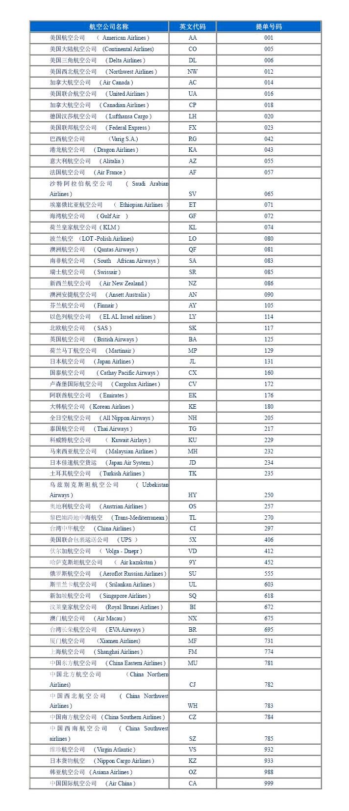 航空公司名称